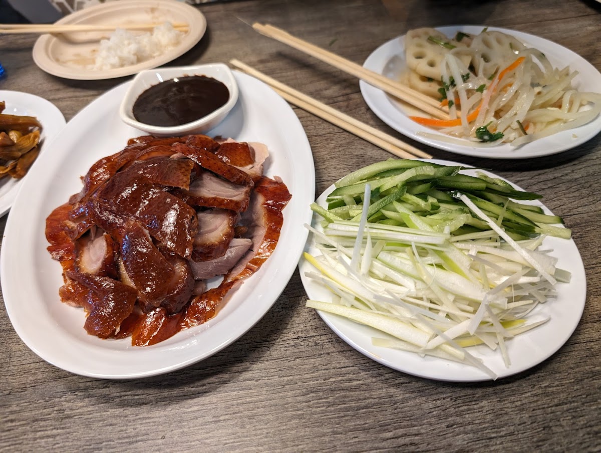 This is a hidden gem! If you love food with duck, u need to try this place! We ordered the roast duck combo, currently $68, with 1) Roast Duck 2) Duck soup, 3) crispy Duck bones. A really really good value!! The restaurant is small but spacious, servers are very nice, but can be more efficiency (food comes slow). 这可能是南加州能找到吃烤鸭最便宜的地方了!点了烤鸭三吃,原价$88,现在打折到$68,超级划算!!烤鸭片出来两片!味道非常好(和北京烤鸭有些许差别,可以忽略不计)。春饼12张,可以单加。黄瓜丝给的超大方! 鸭汤的量也很足。椒盐鸭架特别柴,咬不动,有点失望,但调味是好吃的! 凉菜有点贵,1磅要$12多,味道还可以。第一次贡菜,好脆! 还有很多鸭货可以买,买了鸭脖,不辣!!哈哈,我一直在找不辣的,完美!能吃出来,很新鲜。 人员服务态度很友善,要是效率再高点就好了~ 店不大,感觉有三桌以上,就有点忙不过来。 总结来说,不挑剔用餐环境,单纯想吃烤鸭的,冲!!我以后馋鸭脖,也回来。